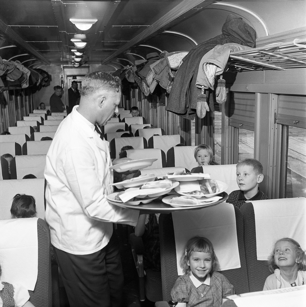 A school class from Hopkins, Minnesota, receives lunch aboard a Soo Line Railroad passenger train while touring the Shoreham Shops in Minneapolis, in November 1959. Photo by Wallace Abbey, Abbey-04-130-05.
