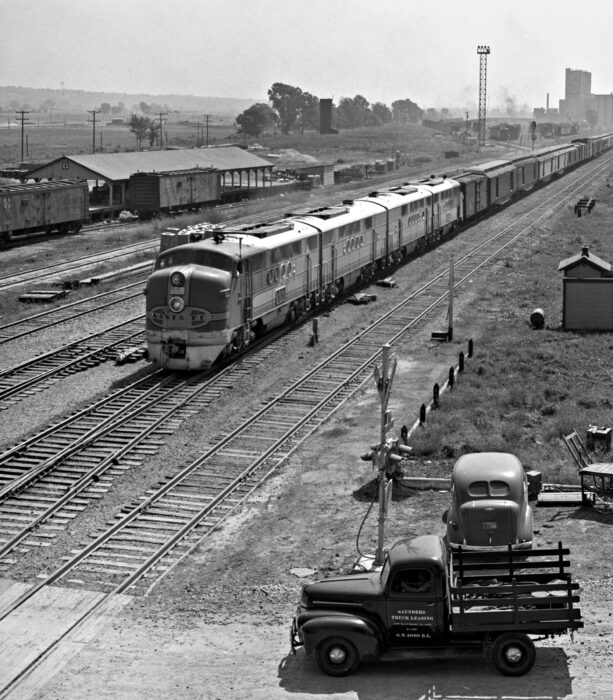 | Binder 3 | Extent 1,558 black-and-white negatives Dates 1946 – 1692 Locations Canada: Quebec United States: Colorado, Illinois, Indiana, Iowa, Kansas, Minnesota, Missouri, Nebraska, Oklahoma, Pennsylvania, Texas, Utah, West Virginia, Wisconsin Railroads Wyoming American Locomotive Company; Atchison, Topeka & Santa Fe Railroad; Baltimore & Ohio Railroad; Canadian Pacific Railroad; Chesapeake & Ohio Railway; Chicago & North Western Railroad; Chicago Great Western Railroad; Chicago North Shore & Milwaukee Railroad; Chicago South Shore & South Bend Railroad; Chicago Transit Authority; Chicago Union Station Company; Chicago, Burlington & Quincy Railroad; Chicago, Milwaukee, St. Paul & Pacific Railroad; Chicago, Rock Island & Pacific Railroad; Denver & Rio Grande Western Railroad; General Electric Company; Gulf, Mobile & Oho Railroad; Illinois Central Railroad; Kansas City Southern Railway; Minneapolis & St. Louis Railway; Missouri Pacific Railroad; Missouri-Kansas-Texas Railroad; Monon Railroad; New York Central Railroad; New York, New Haven & Hartford Railroad; Pennsylvania Railroad; San Francisco Municipal Railway; Soo Line Railroad; Southern Pacific Railroad; Sperry Rail Service; St. Louis-San Francisco Railway; St. Paul Union Depot Company; Union Pacific Railroad; Wabash Railroad; Western Pacific Railroad; Western Railroad Supply Company; White Pass & Yukon Route |