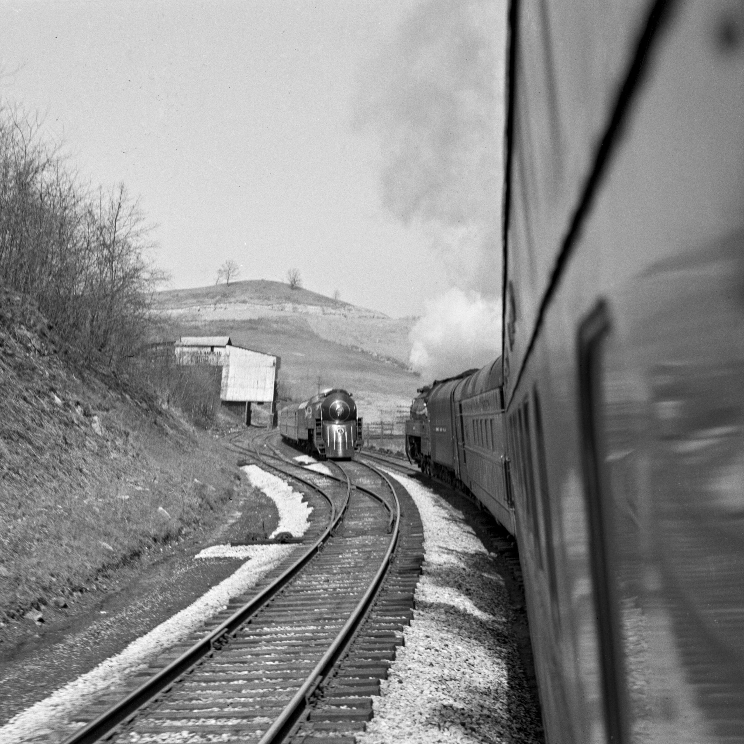Lewis came into his own as a railfan and photographer at Purdue. He made friends with New York Central engine crews who saw him taking pictures. “I began to get cab rides and I was soon taught to fire,” which he did rather than attend Purdue’s football and basketball games—although “I did go out for baseball.” He particularly liked photographing Nickel Plate and New York Central trains as they plied the one percent westward grade out of the Wabash River valley near Purdue. Hal’s “work” as a fireman was known to railroad officials, but they looked the other way. Such an arrangement would be unthinkable today.