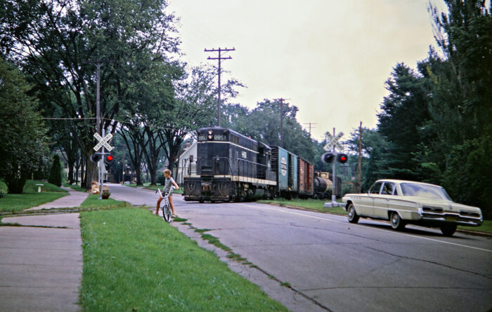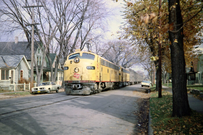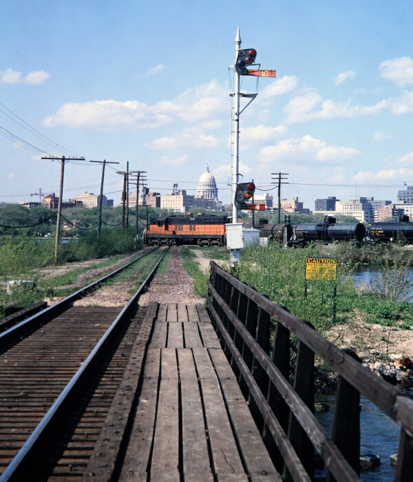 From 1966 to 1970, McIlwraith resided in Madison, Wisconsin while pursuing a PhD (1973) in Historical Geography at the University of Wisconsin. McIlwraith and his wife, Duane, who taught French in Evansville at the time, settled on South Park Street near the main line of the Chicago and North Western Railway. McIlwraith frequently shot images of the line during his walks to campus along Badger Road (prior to the construction of the Beltline Highway). His route also passed the junction of the Milwaukee Road and the Chicago and North Western on Lake Monona. McIlwraith particularly enjoyed photographing the Milwaukee Road’s ‘Varsity’ at this spot during the UW football season.