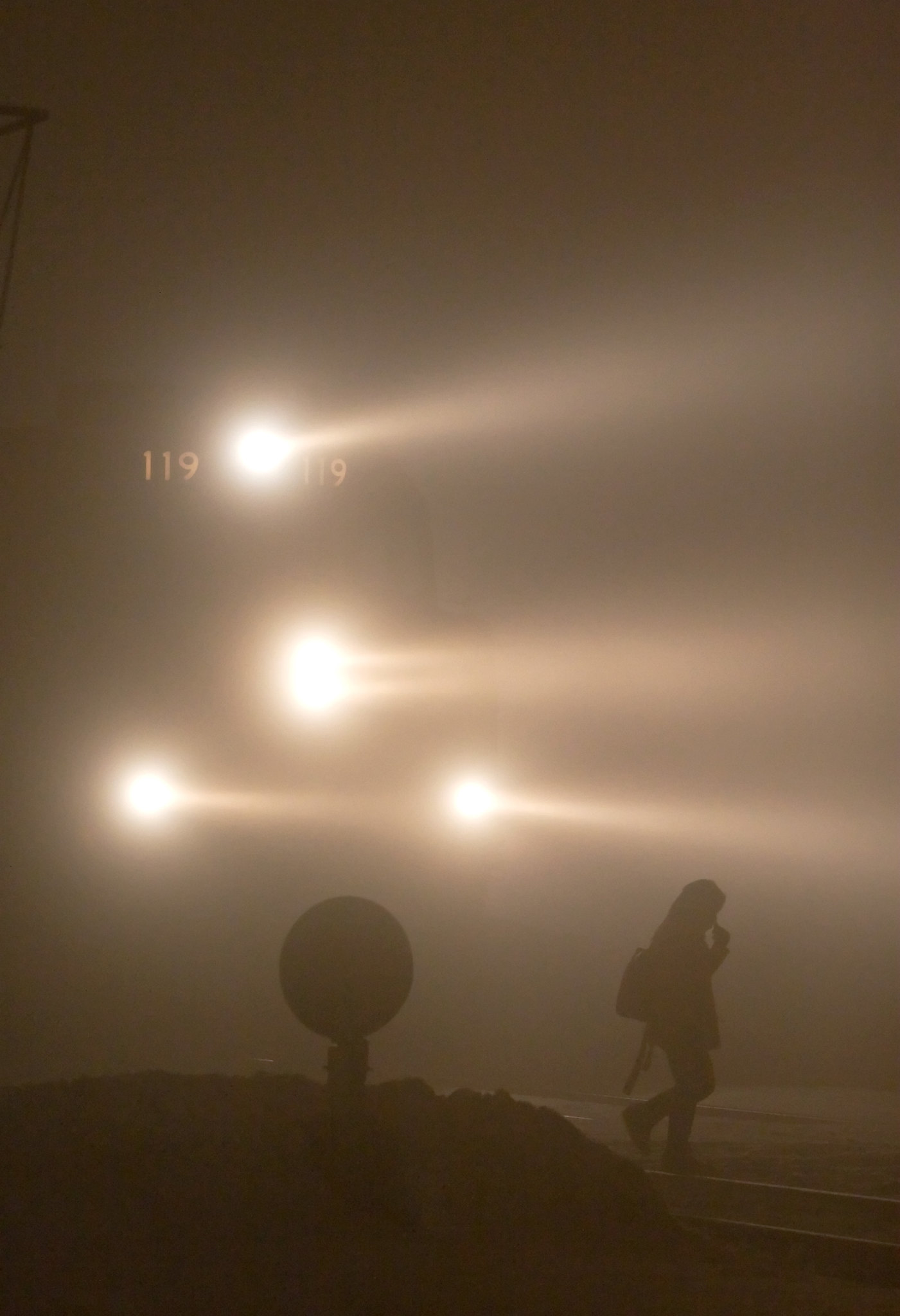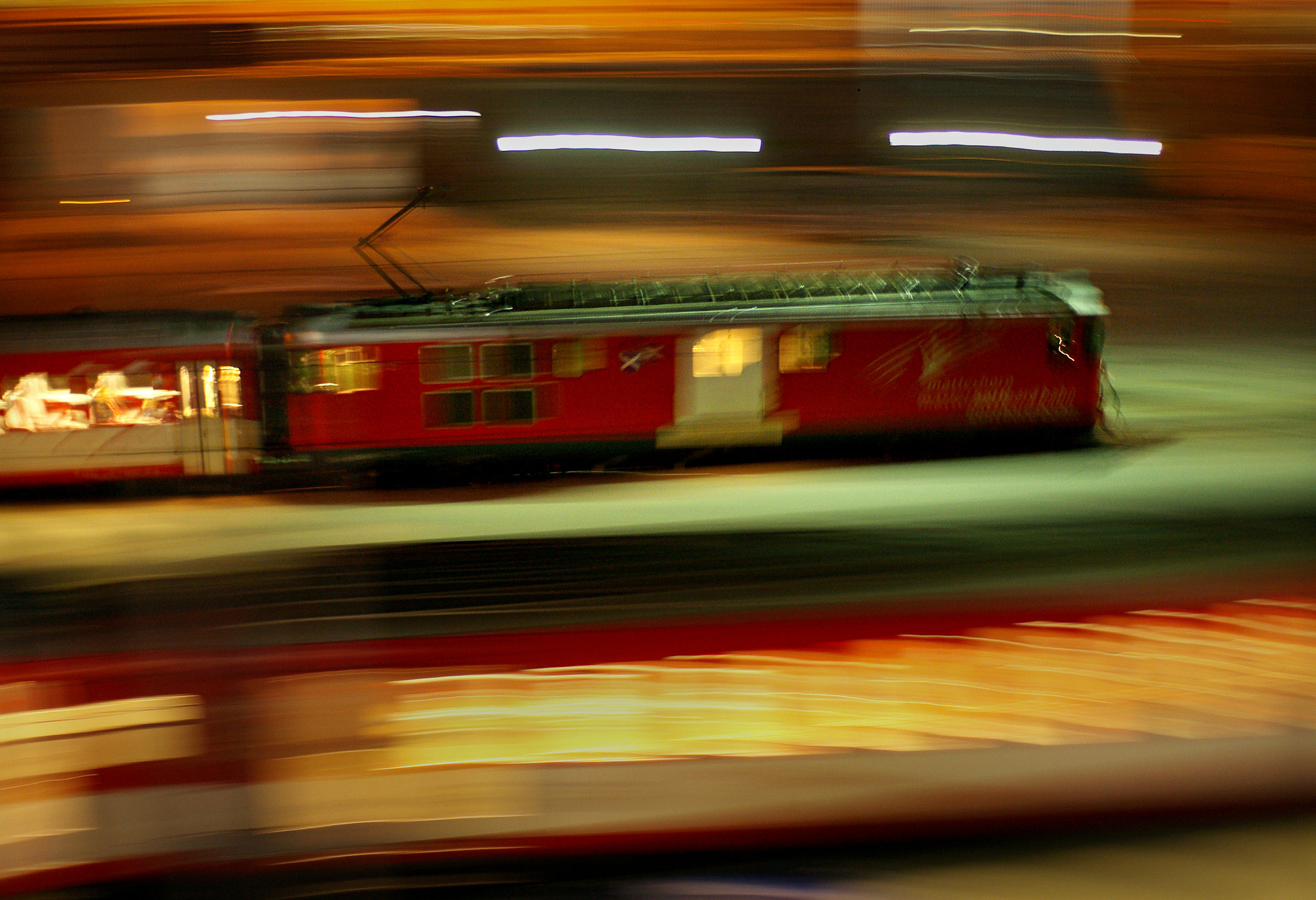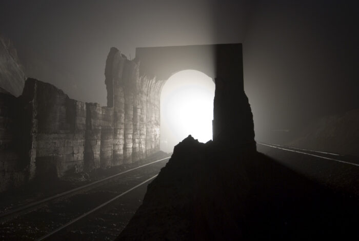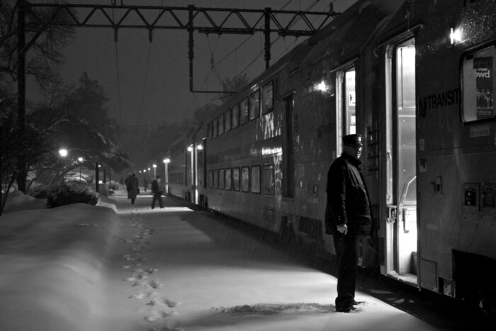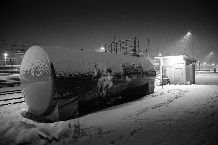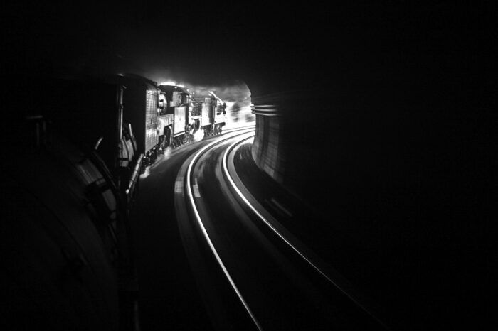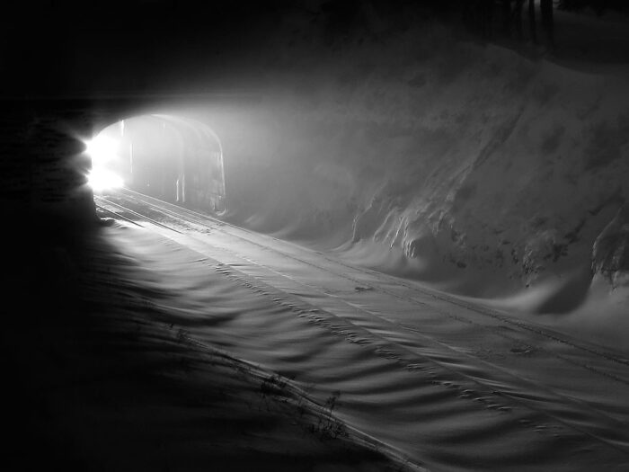 This image called out to me as a striking photo, not because of the low light or the excitement of the approaching train, but because of the texture and tactile feel of the surface in the foreground. The illumination is enough to give us detail and information but low enough to create a mysterious quality. We honestly question if this scene captures the inside of the tunnel or the outside. The snow covering the tracks creates a blanket to soften the setting and the curved top edge of the tunnel continues that organic feeling not always seen in a hard industrial subject. Perhaps the setting almost creates a clichรฉ, but I honestly donโt know what will be coming out of the tunnel- a giant, whooshing steam locomotive or a compact and efficient hybrid, or maybe a dragon.