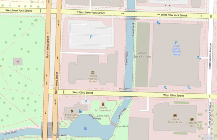 Free parking is available in the lot on the building’s north side; enter from New York Street (which is one-way going east; map courtesy of OpenStreetMap.org).