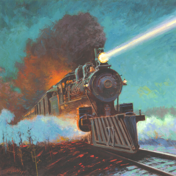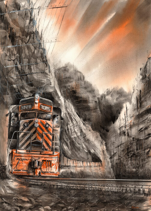 The Kalmbach Art Collection is filled with landmark work from renowned artists such as Howard Fogg, George Gloff, Gil Reid, Ted Rose, John Swatsley, and many others. The works were commissioned for use in Trains magazine and in Kalmbach Books—in many cases created by the company’s own designers and artists. Some works were viewed by tens of thousands of railroad fans, appearing inside the magazine, on its covers, or in best-selling books such as The Hiawatha Story and The Nickel Plate Story.