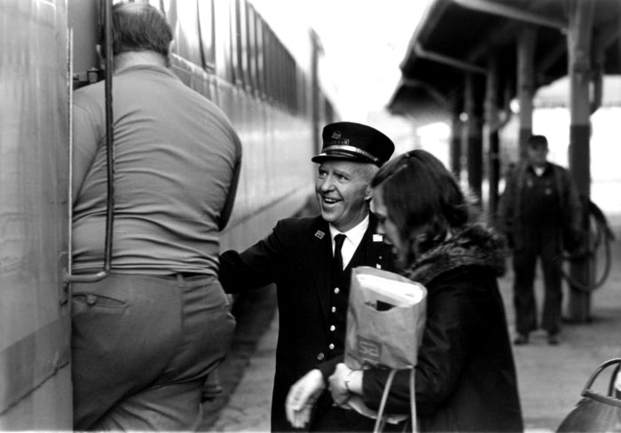 Right: Conductor Tom Burke helps passengers climb abroad the last Milwaukee Road passenger train out of Madison on April 30, 1971. Photograph by John Gruber