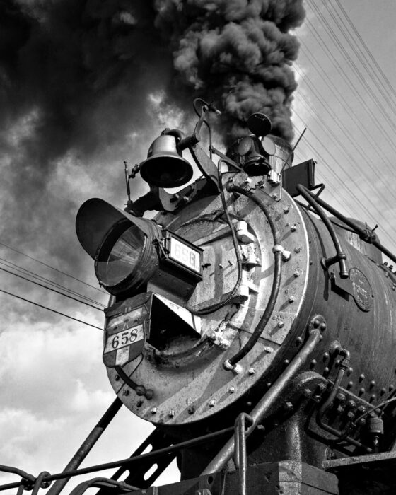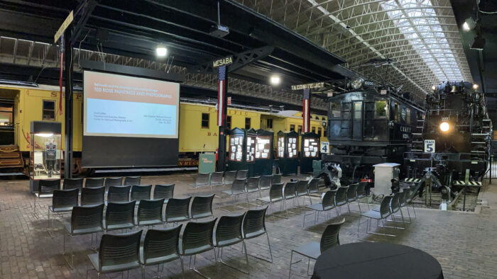 In 2020, the Colorado Railroad Museum and the CRP&A co-hosted an online presentation about Ted Rose featuring Chuck Albi, past president of the Museum, and Scott Lothes, executive director of the Center. In 2022, Lothes gave a gallery talk in conjunction with the Rose exhibition at the Lake Superior Railroad Museum in Duluth, with seating in the main exhibition hall. The locomotive at far right is a Duluth, Missabe & Iron Range 2-8-8-4 “Yellowstone;” Rose photographed a few of them in their final year of service.