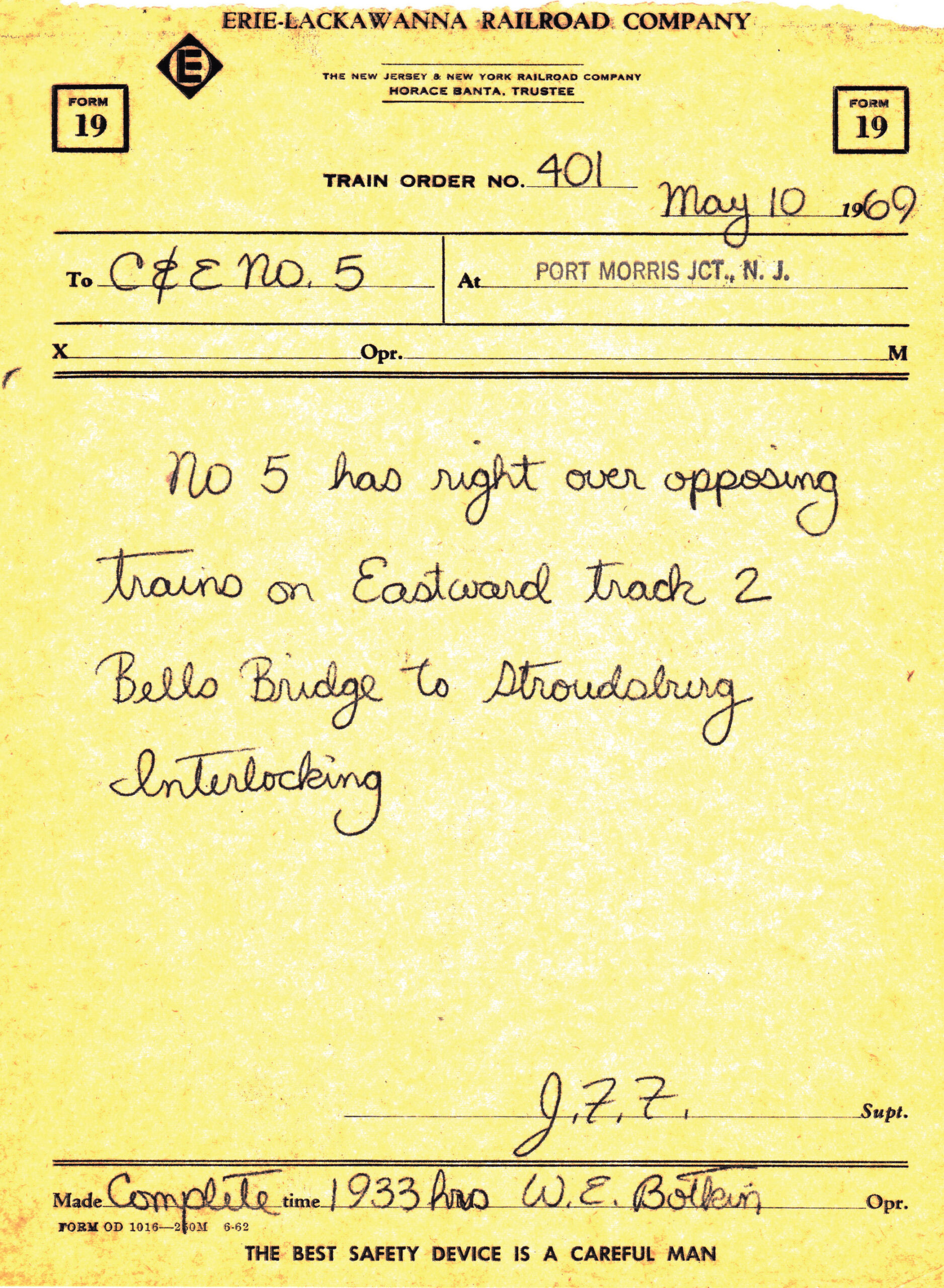 Having ruled out the dispatcher’s record, we next considered the Train Order. Prior to the advent of radios and computers, nearly every railroad in North America utilized a system called Timetable and Train Order operation to safely manage train traffic. While the timetable dictated the schedule of each train and set the meeting points for trains running in opposite directions, the timetable alone was too rigid. Trains frequently ran late; occasionally scheduled trains needed to be canceled; and often extra trains, not listed in the timetable, had to run. As a result, railroads used the train order as a way to amend the timetable. The dispatcher issued train orders, first by telegraph and later by telephone, to operators working in stations and signal towers along the line. The operators copied the orders and passed them to the crew members of each affected train.
