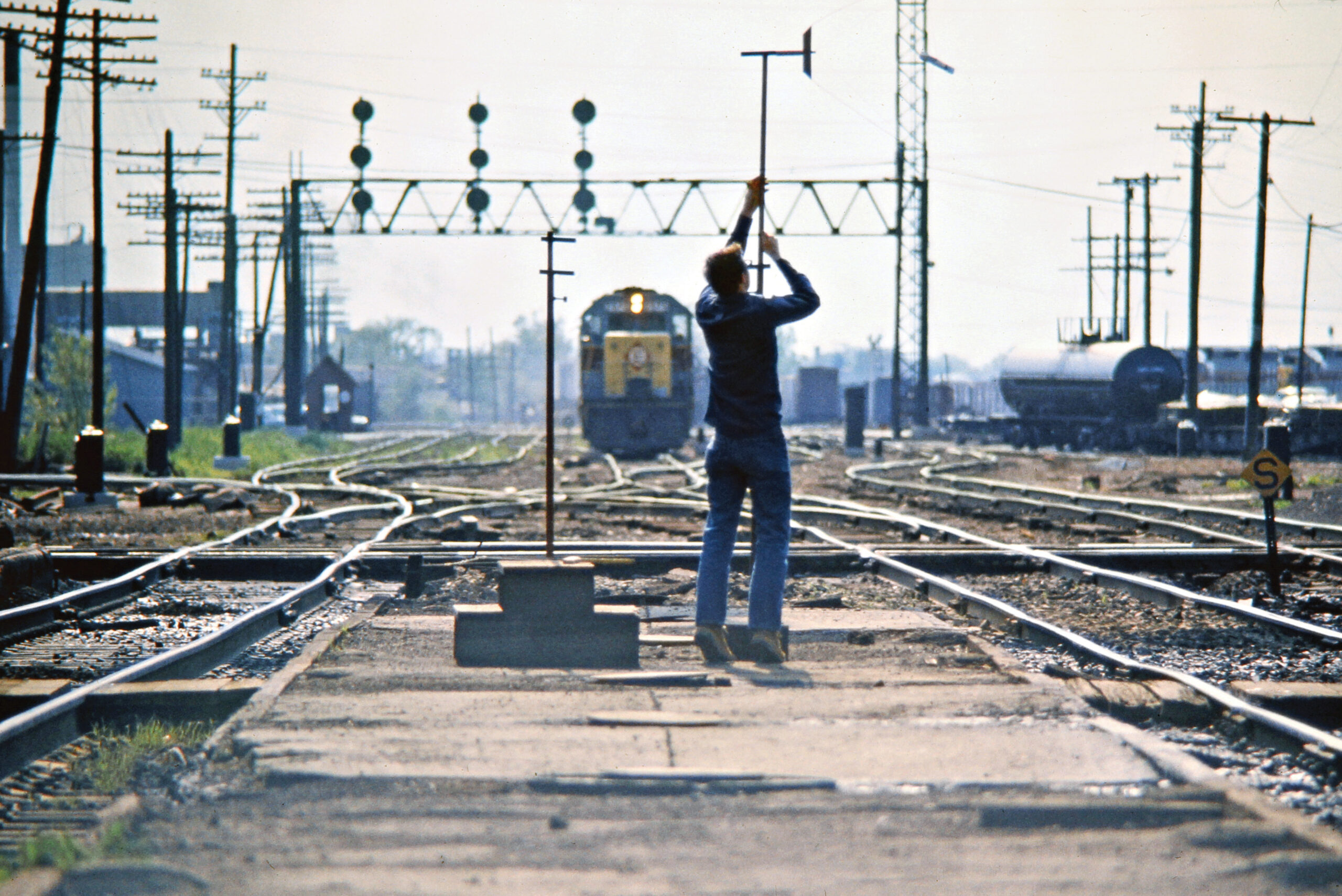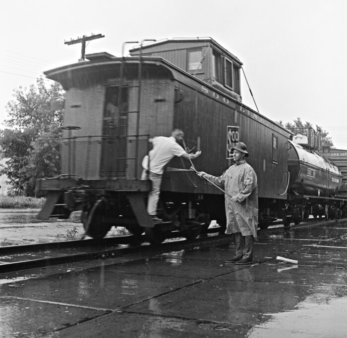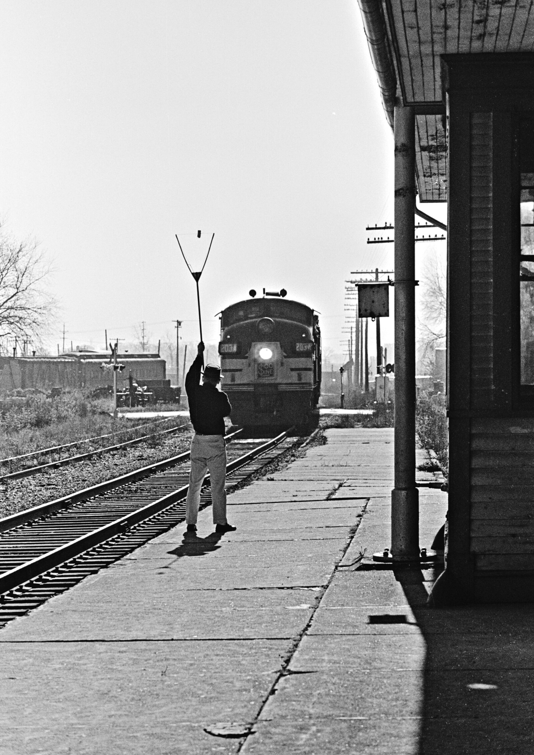 Soo Line relief operator Tony Kunst “hoops up” a train order to a freight train heading west at Mundelein, Illinois, on November 10, 1962. Photograph by Wallace W. Abbey, Abbey-05-079-11