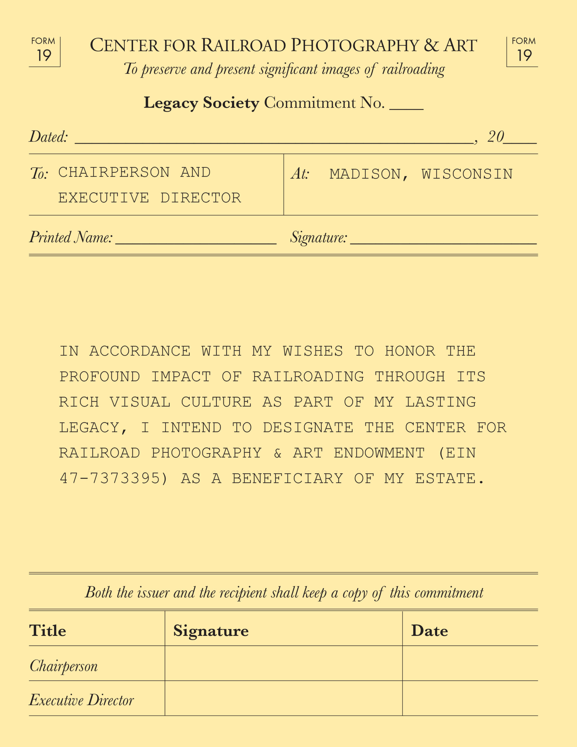 In establishing a legacy society, we wanted to give special recognition to members while symbolically codifying their commitments. The vast paperwork that existed in the railroad industry prior to the digital age gave us many ideas as we designed the commitment form.