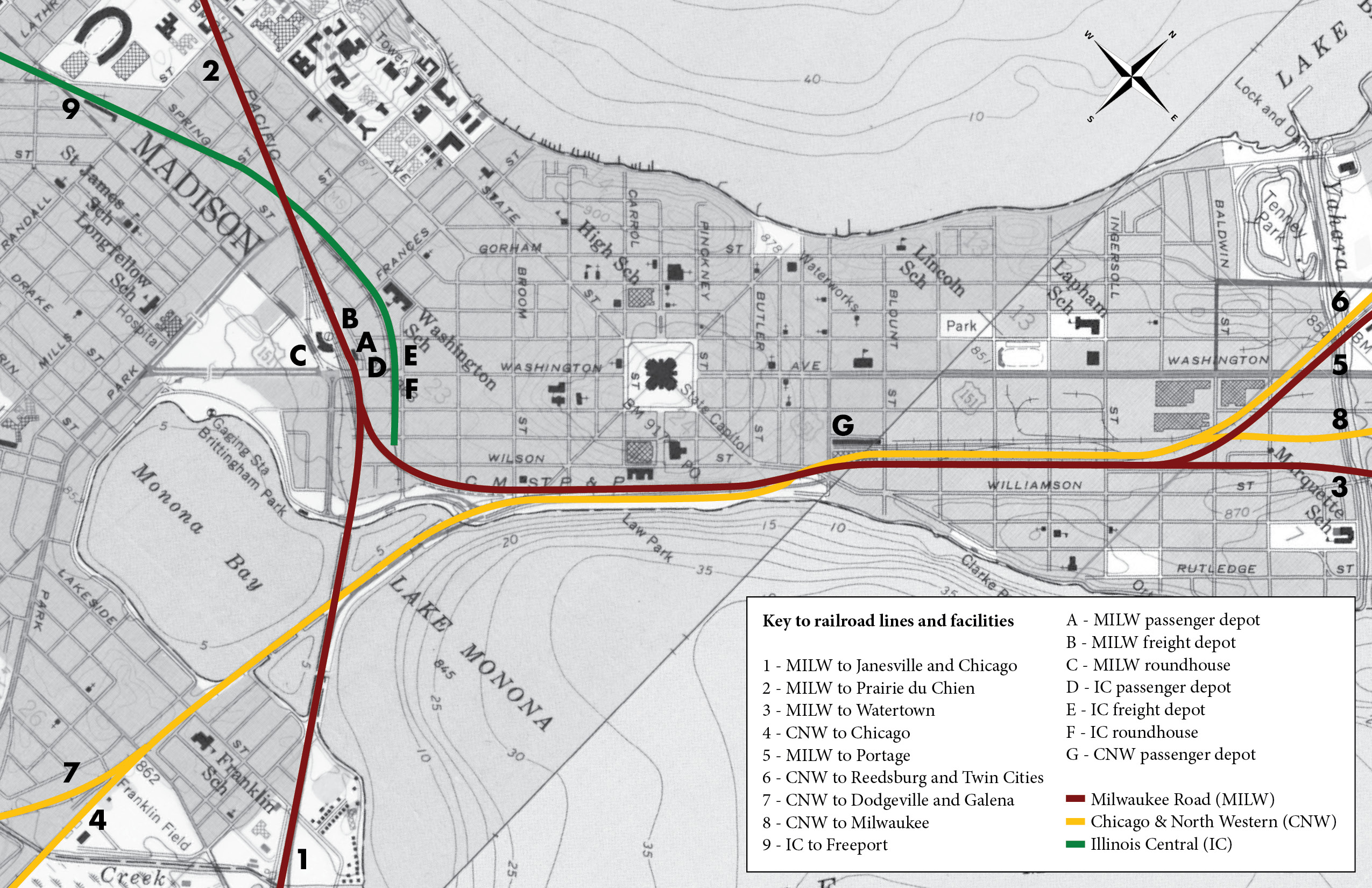 Map of Madison, Wisconsin, with railroads as they appeared during most of the twentieth century.