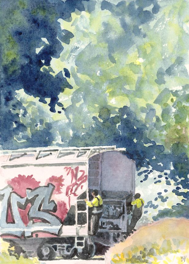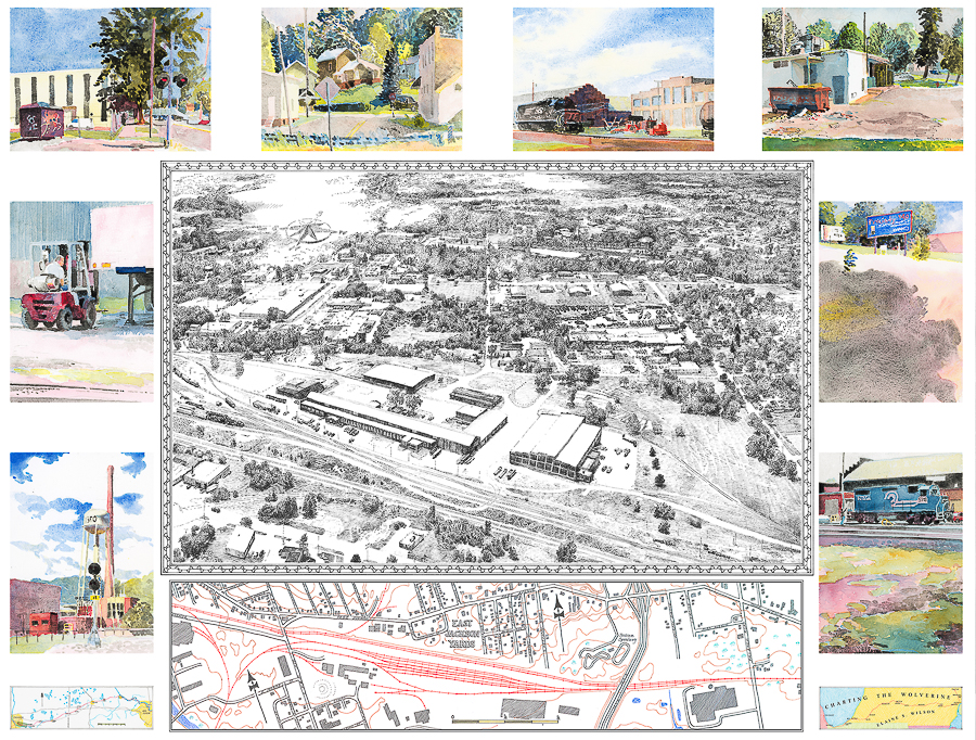 She examines the process from its inception in 2008 to its current state that features thirty-one “map-prints” and more than 200 watercolors that she’s created. Wilson describes her research of historic maps and atlases, and her adventures on the back roads of Michigan and Indiana along railroad lines making watercolors and drawings.